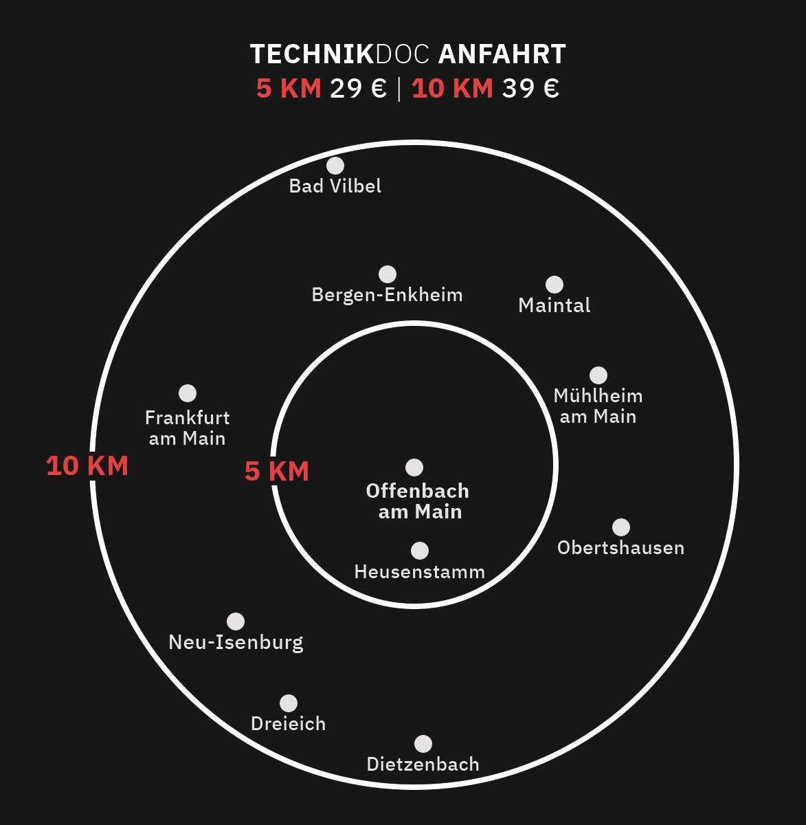 Unsere Anfahrtskosten sind einfach. Für die Anfahrt im Umkreis von 5 Km berechnen wir einmalig 29 €, bis 10 Km nur 39 €.